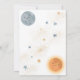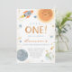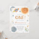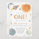 L'invitation présente la conception de l'espace, le soleil, la lune, la fusée, les étoiles et la planète terre. Parfait pour un thème de premier anniversaire.