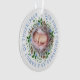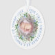 Notre premier Noël en famille de trois ornement acrylique photo bleu couronne pour bébé garçon. Ce design festif présente une photo du nouveau-né dans un cadre de couronne de Noël et le texte : "NOTRE PREMIER NOËL EN FAMILLE DE TROIS. 20XX" en bleu.