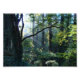 Des rayons blancs brillants du soleil matinal jaillissent de branches sombres vers une forêt estivale verdoyante, avec des arbres massifs recouverts de lierre et des pinces fertiles.