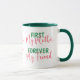 Voici une tasse pour maman pour la fête des mères qui va tirer sur ses cordes de coeur ! Le texte sur les deux côtés est en vert tendre et rose, et dit "D'abord ma mère, Forever mon ami". Votre texte personnalisé est au milieu dans 4 champs faciles à changer, donc vous pouvez aussi faire un cadeau d'anniversaire. Elle le chérira !