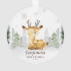 Le premier ornement acrylique de Noël de ce mignon bébé est orné d'une jolie illustration de cerf aquarelle, assis dans une forêt de neige hivernale. Utilisez les outils de modèle en ligne pour personnaliser avec un nom et une année.