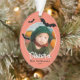 Premier Ornement photo pour chauves-souris noires d'Halloween. Un nom de bébé personnalisé dans un script tendance et 3 chauves-souris noires. Personnalisez l'ornement avec la photo, le nom et l'année de votre bébé. Une belle tenue de vacances Halloween.