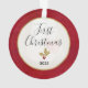 Commémorez le premier Noël de votre précieux paquet avec notre ornement personnalisé et daté de gardien. Le côté avant de notre ornement affiche la photo et le nom de votre nouveau-né avec une mignonne petite baie blanche aquarelle en rouge et or. Le dos affiche "Premier Noël" dans la typographie script moderne, l'année, répète la photo estompé dans l'arrière - plan, et a une branche de couleur d'aquarelle correspondant. #BabysFirst #FirstChristmas #Ornament