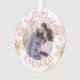 Notre premier ornement photo personnalisé de Noël Engagé avec des flocons de neige et une palette de couleurs d'or, de rougeur, de pêche et de terre cuite. Le modèle photo est configuré pour vous pour ajouter une de vos photos préférées et vous pouvez aussi ajouter vos noms et l'année à l'arrière.