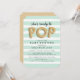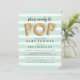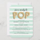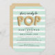 Amis Invitations et famille au baby shower avec une invitation de baby shower "Prêt à pop" mignon et drôle. Les invitations de baby showers modernes et élégants présentent un effet de texte de bulle d'or, une typographie branchée, des rayures vert menthe et blanc, ainsi qu'un motif de pois doré et blanc à l'arrière de l'invitation.