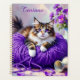 A personalized planner with a tabby cat playing in a ball of yarn next to a vase of purple flowers.