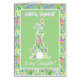 Une jolie carte de voeux de Pâques pour une fille, avec un lapin mignon sur un arrière - plan vert pâle et une bordure de primroses colorées. N'hésitez pas à personnaliser le message intérieur.