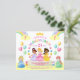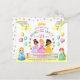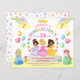 Un thème princesse Enfants Invitation de fête d'anniversaire. Sur un arrière - plan blanc, des princesses aux robes bleues, violettes, roses, jaunes et vertes entourent un podium avec fleurs, ballons, gâteaux et cadeaux. Le texte de typographie indique le Nom de votre enfant Princesse Party, avec une couronne décorative sur le dessus. L'âge de l'enfant est écrit sur deux nuages flanqués d'arcs-en-ciel. Personnalisez-vous en ajoutant tous vos détails sur l'événement et les contacts.