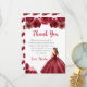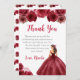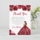 Cette carte de remerciements de Quinceanera dispose d'une belle princesse dans une robe de boule rouge bordeaux aux arrangements floraux. C'est parfait pour une fête d'anniversaire de Quinceanera.