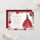 Une luxueuse frise bordeaux fleurie avec princesse dans une glorieuse robe pétillante. Quinceanera invitation pour votre princesse avec deux couleurs face aux arrière - plans noir et blanc pour vous de choisir.