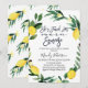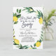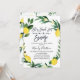 Cette invitation à la douche nuptiale à la couronne de citron comporte une calligraphie de brosse en noir et un citron et une couronne de fleurs. Au fond de l'invitation se trouve un motif au citron et au feuillage. Cette invitation à la douche nuptiale sur le thème de l'agrumes est un moyen sucré pour les invités invitations d'une douche nuptiale à venir.