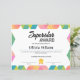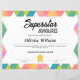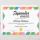 Présentez le Prix des étudiants super-étoiles coloré, une façon vibrante de célébrer des réalisations exceptionnelles en classe! Ce prix attrayant est doté d'un design amusant et ludique, parfait pour reconnaître les étudiants qui brillent de mille feux. Customisez-le facilement avec le nom, la date et un message spécial de l’élève pour le rendre vraiment personnel. Idéal pour les enseignants et les programmes éducatifs, ce prix incite les élèves à continuer d’exceller tout en offrant un souvenir mémorable qu’ils chériront pour les années à venir!