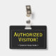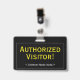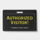 Cette conception de badge professionnel comprend le message "Visiteur autorisé !", ainsi qu'un nom de société personnalisable ou un autre message personnalisé. Il dispose également d'une frontière à une ligne. Un badge comme celui-ci pourrait être utilisé pour montrer que quelqu'un dans une entreprise ou un lieu de travail est un invité ou un visiteur autorisé. [~Z0000307]