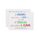 Je pense que le sentiment est clair, oui ... :) Ceux qui pensent autrement n'ont jamais enseigné. Ceci est également disponible avec de l'espace pour la personnalisation sur mes autres posters et produits d'enseignement. Citation originale sur les articles d'enseignants par Sharon Rhea Ford. Articles originaux des enseignants (avec copyright) par Sharon Rhea Ford ... Copyright : Tous droits réservés Enregistré : Sat Fév 07 14:31:50 UTC 2009 Empreinte digitale : Afficher l'empreinte digitale e3860c4f5cfa933c3ebf98f88c327b9377 00b9da37b2ee0a33851d36eddb Titre : Citation d'enseignement Description : Je pense; par conséquent, je suis, et j'enseigne; par conséquent, je peux. MCN : C9E78-CCFC0-4E856 En tant qu'enseignants, nous sommes des professionnels. Ayez un carte de visite prêt à distribuer aux parents. Donnez votre numéro de téléphone scolaire et votre adresse e-mail scolaire. Ajoutez des besoins ou des instructions de base si vous le souhaitez. Vous pouvez utiliser l'espace au dos en conséquence pour ajouter une note générique, supprimer une partie du texte, tout supprimer ... etc! Sur le mien, j'ai utilisé le stock papier le plus cher qui peut difficilement être détruit. Sur ce, j'ai utilisé Standard, donc jouer avec les stocks pour plaire à votre style! Merci et plaisir ! Meilleurs voeux pour l'année scolaire !