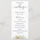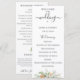 Élégante aquarelle botanique fleurs et feuillage blancs, verts et orange pêche, programme de mariage. Le programme comporte une calligraphie mignonne "mariage" avec plusieurs lignes pour des listes de texte personnalisées pour l'ordre des événements de la cérémonie, le cortège de mariage et le mot de remerciement.