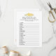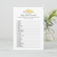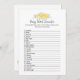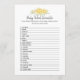 Un jeu amusant pour le genre révéler la fête est le mot Baby scramble. Cette carte de jeu présente des fleurs jaunes en haut. Au verso, un ours en peluche, appuyé sur un tonneau de miel, regarde une abeille au miel avec des modèles.