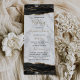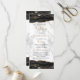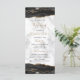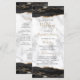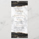 This elegant, modern wedding program features black watercolor agate top and bottom borders trimmed with gold faux glitter. The text appears in elegant gold-colored handwriting and black copperplate font on a gray and white marble background.