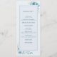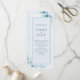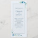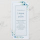 Ce programme de mariage élégant présente une disposition propre et moderne avec de délicats accents botaniques bleus. Des fleurs douces à l'aquarelle et des plantes vertes encadrent le dessus et le bas de la carte, créant une atmosphère fraîche et naturelle. Le design minimaliste utilise une police serif raffinée dans un bleu doux, rehaussant l'aspect contemporain et sophistiqué. Parfait pour les couples à la recherche d'un programme de mariage élégant mais sobre, cette carte recto verso affiche l'ordre de cérémonie et les détails de la fête de mariage dans un format facile à lire. La palette de couleurs bleu et vert cool, associée à de subtiles illustrations florales, apporte un sentiment de calme et d'élégance, idéal pour les mariages de printemps, de jardin ou d'extérieur.