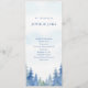 Ce programme de mariage présente une aquarelle bleue tranquille avec une silhouette de forêt brumeuse le long de la bordure inférieure. L'arrière - plan en dégradé doux passe du bleu doux au sommet à un centre blanc propre, créant un effet paisible et élégant. La disposition est moderne et épurée, en utilisant une police serif classique en bleu pour tout le texte. Le devant affiche les noms du couple et un ordre clair de cérémonie. Le verso liste la fête de mariage, y compris le célébrant, les parents, la bonne d'honneur, le meilleur homme, les demoiselles d'honneur, les groomsmen, la fille de fleurs, et le porteur de bague. Un message de remerciement sincère du couple est inclus en bas. Cette carte double face est idéale pour les mariages de bois, d'hiver ou de plein air, offrant un look sophistiqué et apaisant.