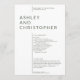 Programme simple minimaliste de cérémonie de mariage dépouillé de l'ornementation étrangère et de priorité de fonctionnalité, équilibre et harmonie. La conception met en évidence les noms du couple comme point focal dans un grand bloc de texte isolé, en déplaçant la marge pour les détails restants. Nettoyer la typographie minimaliste. Le dos de la carte inclut la fête de la mariée et un simple mémoriam détails en texte blanc sur un arrière - plan coloré. Disponible dans un assortiment de riches couleurs modernes. Le design est facilement customisé et personnalisé. Veuillez communiquer avec vous pour obtenir des commentaires ou de l'aide pour répondre à vos besoins individuels. Toujours heureux d'aider ! Remarque : laissez les zones de texte vides pour supprimer ou utiliser l'outil de conception pour des personnalisations plus spécifiques et plus élaborées.