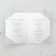 Programme classique de mariage d'art botanique à feuilles bleues dessinées main. Un design feuille simple encerclant vos propres initiales monographiques en bleu sur blanc. Autres couleurs et articles mariages correspondants disponibles. © Dessin et dessin de la feuille d'origine par Sarah Trett pour www.mylittleedenweddings.com sur Zazzle.