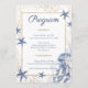 Guide your guests through your celebration with this elegant coastal themed wedding program card. This double-sided design features delicate dusty blue watercolor starfish and subtle gold sea kelp illustrations, framed by a chic gold geometric border. Perfect for a coastal, or beach-themed wedding. This custom ceremony program adds a beautiful, sophisticated touch to your seating area and serves as a lovely keepsake for your guests.
