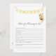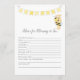 Un jeu amusant pour le baby shower est le jeu Conseils pour maman-à-être. Ce jeu comporte une bannière jaune au sommet et un ours en peluche avec une abeille. Au verso, un ours en peluche s'appuie sur un tonneau de miel en regardant une abeille au miel avec des modèles.