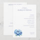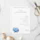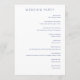 Ce programme de mariage présente une mise en page épurée et minimaliste avec un espace blanc généreux, créant une atmosphère élégante et sophistiquée. Le design comprend une illustration aquarelle de pivoines bleues sur le côté gauche, ajoutant une touche de beauté naturelle à la composition. La typographie combine des polices serif et sans-serif pour un look moderne et classique, tandis que la palette de couleurs est principalement composée de bleu marine profond et de gris clair, renforçant l'ambiance sereine et formelle. Parfait pour les couples qui recherchent un design raffiné et festif pour leur jour spécial.