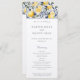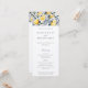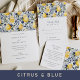 Lemon Grove & Blue Azulejo Wedding Program Ce programme de mariage à deux côtés présente une citronnelle rafraîchissante et un azulejo bleu qui encadre parfaitement les détails de la cérémonie mariage. La partie avant accueille les invités aux noces du couple heureux, avec leurs noms bien en vue, et décrit la procession de la cérémonie. Le côté arrière présente la fête de mariage, des parents du couple à l'officiant, dans une police élégante qui complète le motif lumineux et animé en haut et en bas. Ce programme est un joli gardien qui guidera les invités à travers les événements de la journée et apportera une touche de charme méditerranéen à l'occasion.