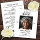 Programmes de célébration de la vie en noir et blanc classiques avec un grand portrait centré et une mise en page structurée de l'ordre du service, offrant un hommage intemporel et digne pour les services commémoratifs. Cette conception de programme de funérailles abordable présente une photo mise en avant, encadrée par des polices serif et script raffinées, avec un texte entièrement modifiable. La palette monochrome et le titre gras créent un ton formel mais accessible, ce qui la rend idéale pour honorer votre proche avec grâce. Le verso comprend un modèle clair et organisé pour un ordre de service. Cette mise en page minimaliste et élégante est parfaite pour les familles qui recherchent un programme de funérailles basé sur une photo, conçu de manière professionnelle, qui combine la beauté, la fonctionnalité et une personnalisation sincère en un seul élément.