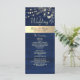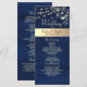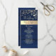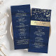 Ce programme de mariage bleu navy rustique présente des lumières guinguettes lumineuses et une délicate illustration florale dorée, parfait pour un mariage d'hiver ou de grange. Avec un espace pour les détails de la cérémonie, les noms du cortège nuptial et un mot de remerciement personnel, ce design élégant apporte chaleur et charme à votre jour spécial.