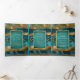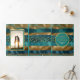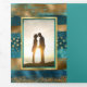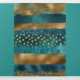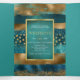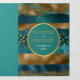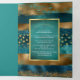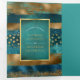 Programme de mariage triptyque avec des traits de pinceau bleu sarcelle et or et des confettis. Ce beau design présente des traits de pinceau sarcelle et or ainsi que des confettis. Votre texte est dans un cadre sarcelle avec une bordure dorée. Il est parfait pour un mariage d'automne ou d'hiver.