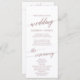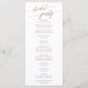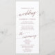 Ce programme de mariage élégant en calligraphie or rose est parfait pour un mariage simple. Le design rose poudré présente une carte minimaliste décorée d'une typographie romantique et fantaisiste en faux or rose. Incluez le nom de la mariée et du marié, la date et le lieu du mariage, un message de remerciement, l'ordre du service, le cortège nuptial et un mémorial "en souvenir aimant" facultatif.