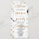 Célébrez votre union céleste avec le programme de mariage Modern Celestial Moon Sun and Stars Mariage Suite. Cet élégant design présente un motif céleste en noir et or, présentant un ensemble céleste d'étoiles, de soleils et de lunes contre un arrière - plan blanc immaculé, créant une tapisserie céleste aussi enchanteresse que le ciel nocturne. Le texte du programme est présenté avec art dans un mélange d'impression simple, d'impression décorative et de script élaboré, ajoutant une touche de sophistication et de fantaisie. Les couleurs du texte, en noir et or, s'harmonisent parfaitement avec le thème céleste, créant un contraste visuel étonnant qui séduira vos invités. La première du programme accueille les invités avec le mot "Bienvenue", suivi des noms du couple, de la date et du lieu du mariage et de l'ordre de la cérémonie. Le verso du programme énumère les membres de la fête de mariage, s'assurant que tous ceux qui participent à votre journée spéciale sont reconnus et appréciés. Retournez sur le programme, et vous découvrirez que le fond présente le même design céleste que le devant, créant une présentation cohésive et visuellement étonnante. Cette attention minutieuse aux détails garantit que chaque aspect du programme est un véritable reflet du style céleste, ouvrant la voie à une cérémonie mariage qui sort de ce monde. Que vous soyez un stargazer, un enfant de lune, ou simplement quelqu'un qui apprécie la beauté du cosmos, ce programme de mariage est le choix parfait pour quiconque aime les thèmes célestes. C'est une célébration céleste de l'amour et de l'engagement qui est destinée à être rappelée pour toujours.