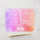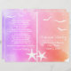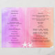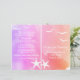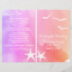 Eau rose, violet et corail abstrait moderne avec plage d'étoiles de mer et de mouettes plié cérémonie mariage et programme de fête avec une peinture à l'aquarelle peinte à la main avec texture, deux étoiles de mer et mouettes en blanc et texte en blanc.