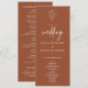 Le programme de mariage Rustic Burnt Orange Elegant Boho est le mélange parfait de sophistication et de charme rustique, conçu pour les couples qui souhaitent que les détails de leur cérémonie soient présentés avec style et chaleur. Doté de riches tons orange brûlé et d'éléments de design subtilement inspirés du style bohème, ce programme complète les mariages d'automne, les célébrations en plein air et les lieux rustiques chic. Il offre une belle façon de partager l'ordre des événements, les noms des participants au mariage et les notes spéciales avec les invités tout en améliorant l'esthétique globale de votre journée. Entièrement personnalisable sur Zazzle, il permet aux couples de personnaliser chaque détail, ce qui en fait un ajout significatif et mémorable à leur suite de papeterie de mariage.