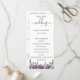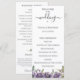 Fleurs aquarelles violettes et branches botaniques vertes, programme de mariage. Le programme comporte une calligraphie mignonne « mariage » avec plusieurs lignes pour les listes de texte personnalisées pour l'ordre des événements de la cérémonie, le cortège de mariage et le mot de remerciement.