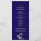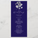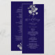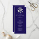 Célébrez votre cérémonie avec style avec ce programme de mariage élégant, mettant en vedette un fond bleu royal profond et des illustrations florales argentées gracieuses. La mise en page offre un format propre et facile à lire pour vos invités, ce qui en fait un choix sophistiqué pour les mariages d'hiver et les mariages formels.