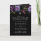 Programme de mariage floral élégant et d'humeur sombre avec une bordure supérieure de fleurs violettes et bordeaux, un feuillage vert luxuriant et des baies sombres. Le programme de mariage floral violet est complété par une typographie élégante et moderne. Personnalisez le devant du programme de mariage floral gothique avec vos noms, date de mariage et lieu. L'intérieur du programme de mariage plié affiche l'ordre du service et une liste de vos participants au mariage. Conçu pour se coordonner avec notre collection de mariage floral gothique et sombre.