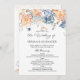 Cette conception présente une illustration aquarelle de fleurs roses pêche pâle et bleues avec des confettis à effet doré sur le dessus de la carte.