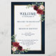 Elégante et moderne carte de programme de mariage géométrique aquarelle fleurie et romantique dispose d'une belle bordeaux / marsala, rose roux, pêche, roses bleu marine aquarelle avec feuillage assorti sur bleu marine bois arrière - plan et cadre or. Parfait pour un mariage d'automne/mi-été. S'il vous plaît trouver d'autres modèles et variantes de mon magasin "blissweddingpaperie". Et n'hésitez pas à me contacter pour plus de personnalisation ou de correspondance d'éléments