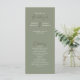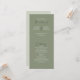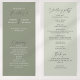 Un programme de mariage intemporel avec des titres écrits à la main sur un arrière - plan vert sauge clair et foncé. Un script élégant et des polices serif classiques se combinent pour mettre en évidence les noms du couple et les détails du mariage. Parfait pour les mariages d'inspiration nature ou minimaliste avec une touche romantique.