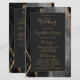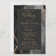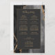 Ce programme de mariage élégant et moderne présente un fond d'agate noire rehaussé de paillettes dorées factices. Le texte apparaît dans une écriture manuscrite dorée élégante et des polices copperplate sur un rectangle noir cassé.