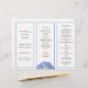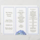 Programme de mariage triptyque. Ajoutez votre propre texte aux modèles fournis sur ce papier de format lettre (21,59 x 27,94 cm). Chaque section a une bordure bleue avec une fleur d'hortensia bleue en bas de la section centrale. Le texte du modèle est vert foncé. Se pliera en trois dans le style accordéon. Le verso n'aura aucune impression. Illustré sur le papier le plus épais - toile - qui peut être modifié.