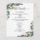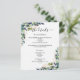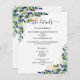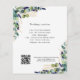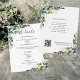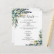 Un mariage moderne, élégant détails / programme / chronologie. Un arrière - plan blanc décoré de verdure d'eucalyptus et de feuillage doré. Personnalisez et ajoutez vos noms et les détails du mariage. Lettres de couleur noire. Texte des deux côtés. Ajoutez l'URL de votre site Web mariage au code QR situé au verso. 1 feuille = 1 programme imprimé de bord en bord.
