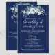 Gras bleu marine et blanc peony programme de mariage floral soirée pour un mariage d'hiver moderne. Un élégant spray botanique de feuilles verts se déroule au-dessus du script blanc manuscrit branché pour un magnifique événement moderne.
