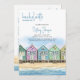 Invitation pour un week-end de Beach Bachelorette avec itinéraire. Conception à l'aquarelle représentant une rangée de cabines de plage colorées et peintes au bord de l'océan sur du sable doré, profitant de vues sur la mer de première ligne et d'un ciel bleu estival. Le modèle est configuré pour que vous puissiez ajouter les détails du week-end et de l'organisateur avec votre itinéraire de week-end au verso. Si vous devez apporter des modifications aux titres ou à l'espacement, par exemple, cliquez sur "modifier à l'aide de l'outil de conception".