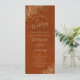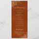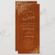 Ce magnifique programme de mariage présente un design élégant avec du texte en or sur une rouille orange ou un arrière - plan couleur couleur nombre brûlé et des boucles et tourbillons en faux feuille doré en dentelle dans les coins. Les titres sont écrits en calligraphie de script sophistiquée, et il y a de l'espace pour vos détails de cérémonie et de mariage, ainsi qu'un bref merci pour vos invités. Merveilleuse façon d'accueillir vos amis et votre famille à votre fête mariage.