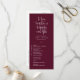 Cet élégant programme de mariage à plat comprend une calligraphie élégante et une police de typographie sans serif simple sur un arrière - plan bordeaux pour un look épuré minimaliste et moderne, ce qui est une belle façon d'informer vos invités de l'ordre de votre cérémonie de mariage. La simplicité de ce design ajoute une touche d'élégance à votre mariage. Il fonctionne bien avec de nombreux thèmes mariages et certainement un grand ajout à votre papeterie mariage. Il suffit de customiser les noms et le libellé en quelques étapes simples et de personnaliser le code QR et le hashtag pour donner à votre programme une touche personnelle agréable. Veuillez noter : La calligraphie élégante de la formulation "à aimer, rire et heureux toujours après" ainsi que les lignes et d'autres illustrations graphiques et éléments ne peuvent pas être modifiés, supprimés, ou déplacés. Elles sont réparées.