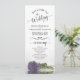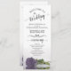 Ce magnifique programme de mariage présente un design élégant avec une seule longue tige de violet poussiéreux, lavande ou rose couleur bruyère couché sur son côté réfléchissant dans l'eau. Les titres sont écrits en calligraphie de script sophistiquée, et il y a de l'espace pour vos détails de cérémonie et de mariage, ainsi qu'un bref merci pour vos invités. Merveilleuse façon d'accueillir vos amis et votre famille à votre fête mariage.